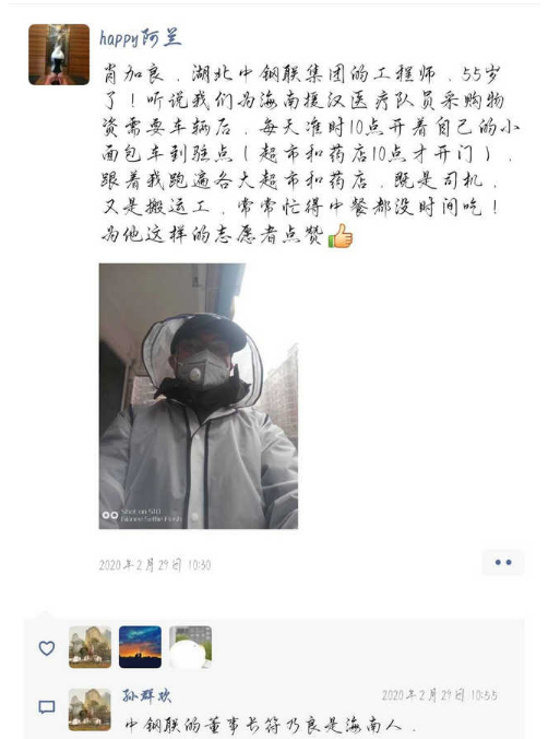 肖加良,湖北中鋼聯機械制造廠廠長,在公司算比較年長,已經55歲了,聽說區工商聯組織人員保障海南省援漢醫療隊,保障隊缺司機和車輛,他二話不說就帶車加入保障隊伍,從2月5日開始一直到上周,每天開著自己的面包車輾轉各大超市、藥店和醫療隊駐地,既當司機又當搬運工,有時候忙的飯都顧不上吃,還要時刻做好防護和消毒工作,我們要為他的行為點贊。